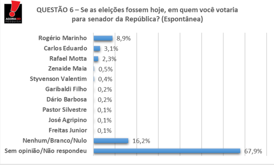O Jornal das 6 divulgou hoje (16), com exclusividade, os números da pesquisa AgoraSei/96FM. Para o Senado Federal, a pequisa apontou empate técnico entre o ex-prefeito de Natal, Carlos Eduardo Alves (PDT) e o ex-ministro do Desenvolvimento Regional, Rogério Marinho (PL) no levantamento estimulado. Confira os números: