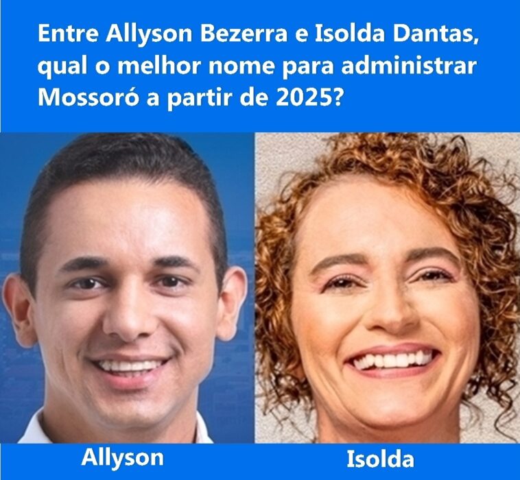O MOSSORÓ NEWS traz agora uma nova enquete sobre o pleito eleitoral do próximo ano em Mossoró, desta feita, o embate direto entre o prefeito Allyson Bezerra (SD), que ficou com 43% dos votos na enquete anterior, e a deputada Isolda Dantas (PT), que ficou na segunda colocação com 26%.