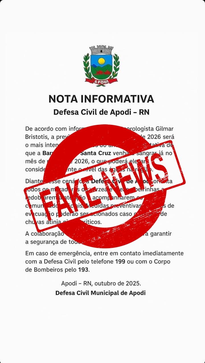 O Mossoró News apurou que a Defesa Civil Municipal de Apodi não emitiu nenhum comunicado desse tipo. A informação foi negada oficialmente pelo órgão, que classificou o conteúdo como falso.