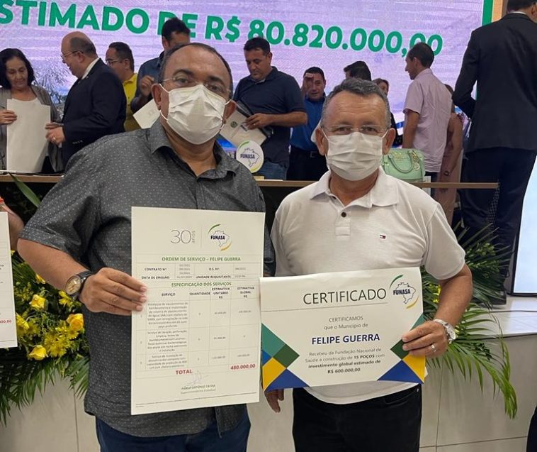 A entrega simbólica dos recursos e equipamentos ao prefeito Salomão, foi feita pelo superintendente da Funasa RN, Pablo Tatim, com a presença do deputado federal João Maia, autor da destinação dos recursos, os quais somam-se a outros R$ 1,5 milhão entregues pela Funasa ao Município em maio do corrente ano, totalizando assim mais de R$ 2,5 milhões em investimentos visando a segurança hídrica e o desenvolvimento da agricultura e pecuária de Felipe Guerra.