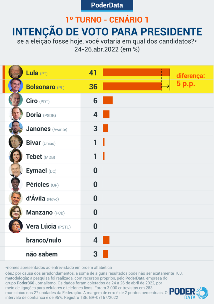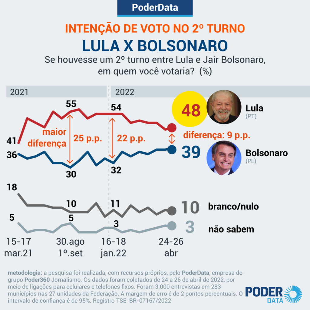 A pesquisa foi realizada pelo PoderData, empresa do grupo Poder360 Jornalismo, com recursos próprios. Os dados foram coletados de 24 a 26 de abril de 2022, por meio de ligações para celulares e telefones fixos. Foram 3.000 entrevistas em 283 municípios nas 27 unidades da Federação. A margem de erro é de 2 pontos percentuais. O intervalo de confiança é de 95%. O registro no TSE é BR-07167/2022.