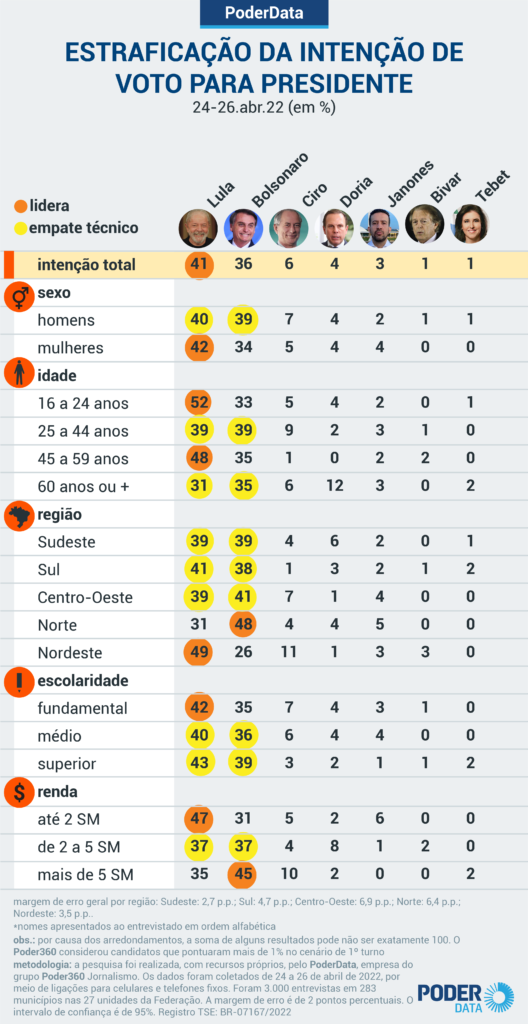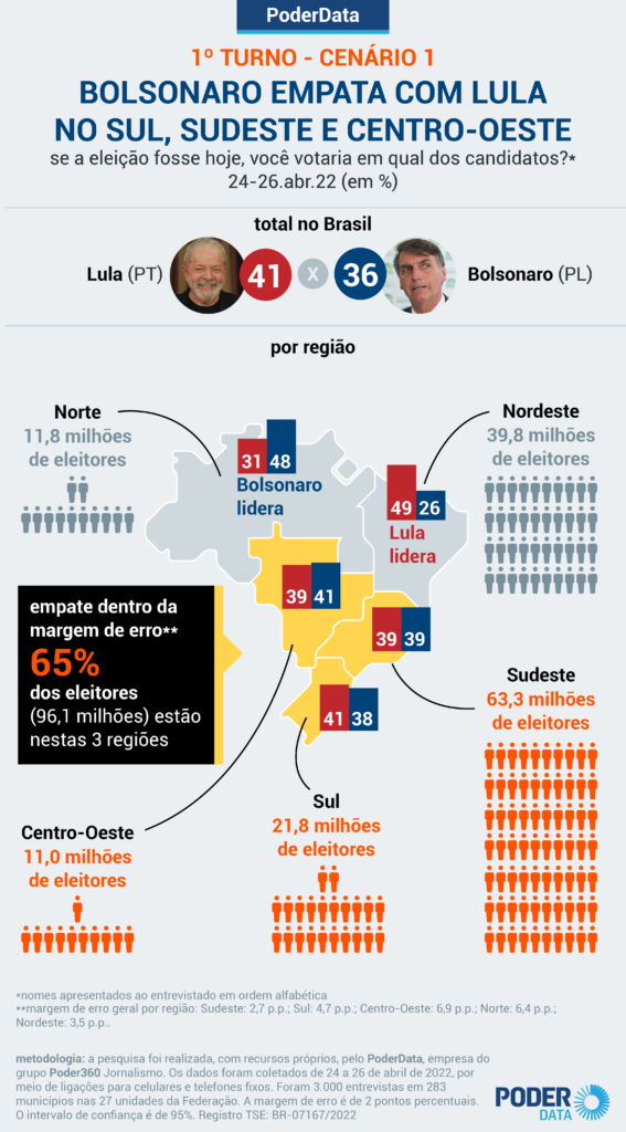 Pesquisa PoderData realizada de 24 a 26 de abril de 2022 mostra Luiz Inácio Lula da Silva (PT) empatado tecnicamente com Jair Bolsonaro (PL) em 3 das 5 regiões do país para o 1º turno das eleições de 2022. Essas 3 regiões concentram 65% dos eleitores brasileiros.