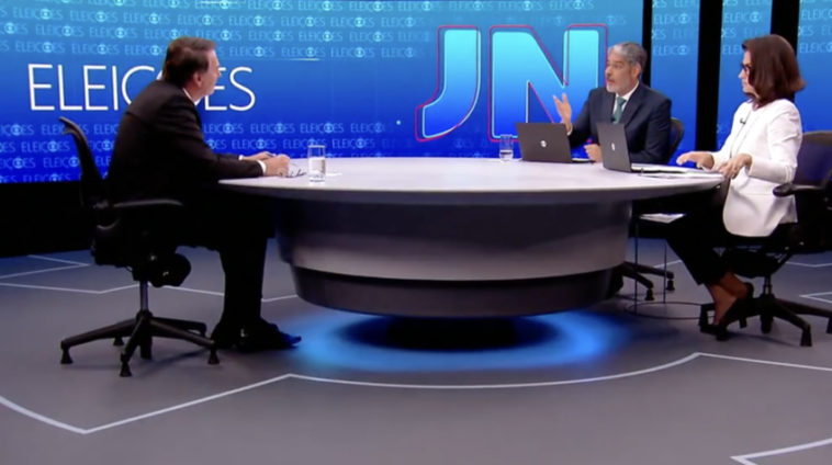 O presidente e candidato à reeleição, Jair Bolsonaro (PL), usou 24min37s dos 40 minutos de entrevista desta segunda-feira (22.ago.2022) ao Jornal Nacional, da Rede Globo. O restante do tempo (15min23s) foi ocupado pelas perguntas dos apresentadores William Bonner e Renata Vasconcellos.