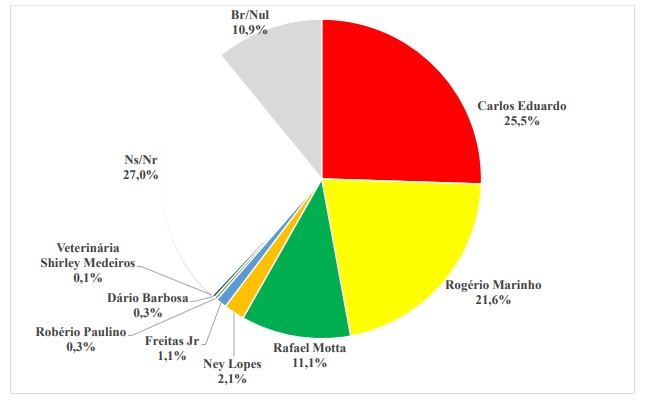 O deputado federal Rafael Motta (PSB) vem logo em seguida com 11,1% das intenções de voto. O ex-senador Ney Lopes (Brasil35) aparece em quarto com 2,1% da preferência do eleitorado.