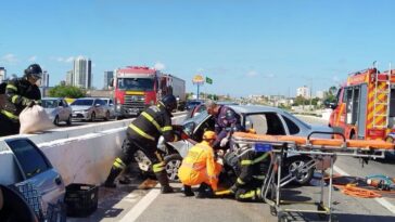 Dois veículos colidem no viaduto do Abolição III e deixam pelo menos dois feridos presos às ferragens
