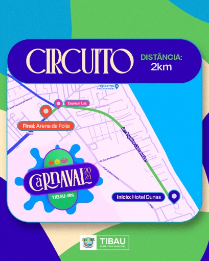 Os foliões terão um formato de percurso único e inédito durante este Carnaval de Tibau, que inicia no Hotel Dunas e se estende por 2km por toda a Av. Angelita Clementino, passando pelo Espaço Luz e parar no Arena da Folia, na entrada da cidade.