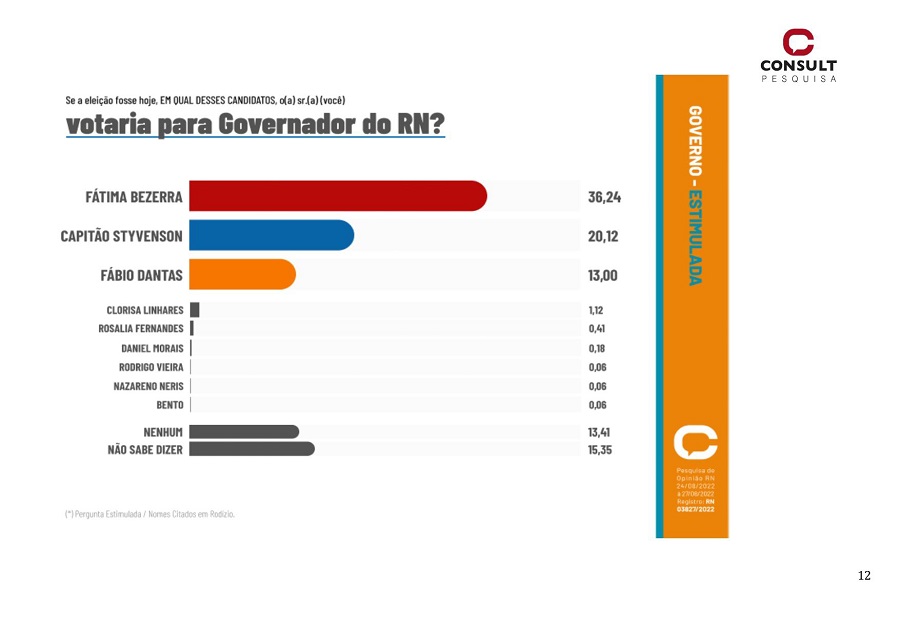 A pesquisa TN/Difusora/Consult mostra a candidata à reeleição, governadora Fátima Bezerra (PT), em primeiro lugar, com 36,24% das intenções de votos na sondagem estimulada, na qual é apresentada a lista com os nomes de todos os candidatos ao governo do Estado. Em segundo lugar, aparece o senador Styvenson Valetim (Podemos), com 20,12% e em terceiro lugar vem o ex-deputado Fábio Dantas (SD), com 13%.