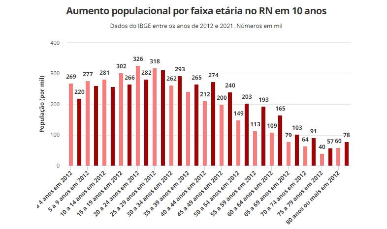 Por outro lado, a população potiguar cresceu em todas as faixas etárias acima dos 30 anos.