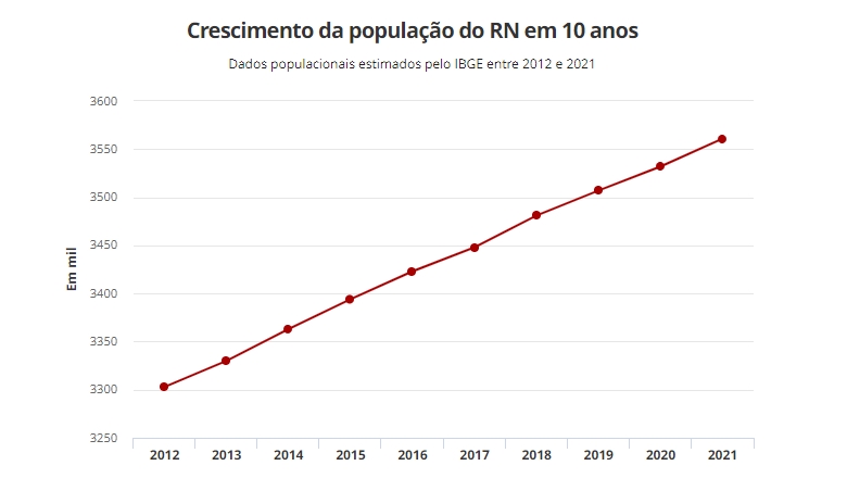 Na década, o número de moradores do estado cresceu 7,8% – um aumento de 258 mil pessoas – segundo dados do IBGE. O estado saltou de 3.302.720 habitantes em 2012 para 3.560.903 em 2021.