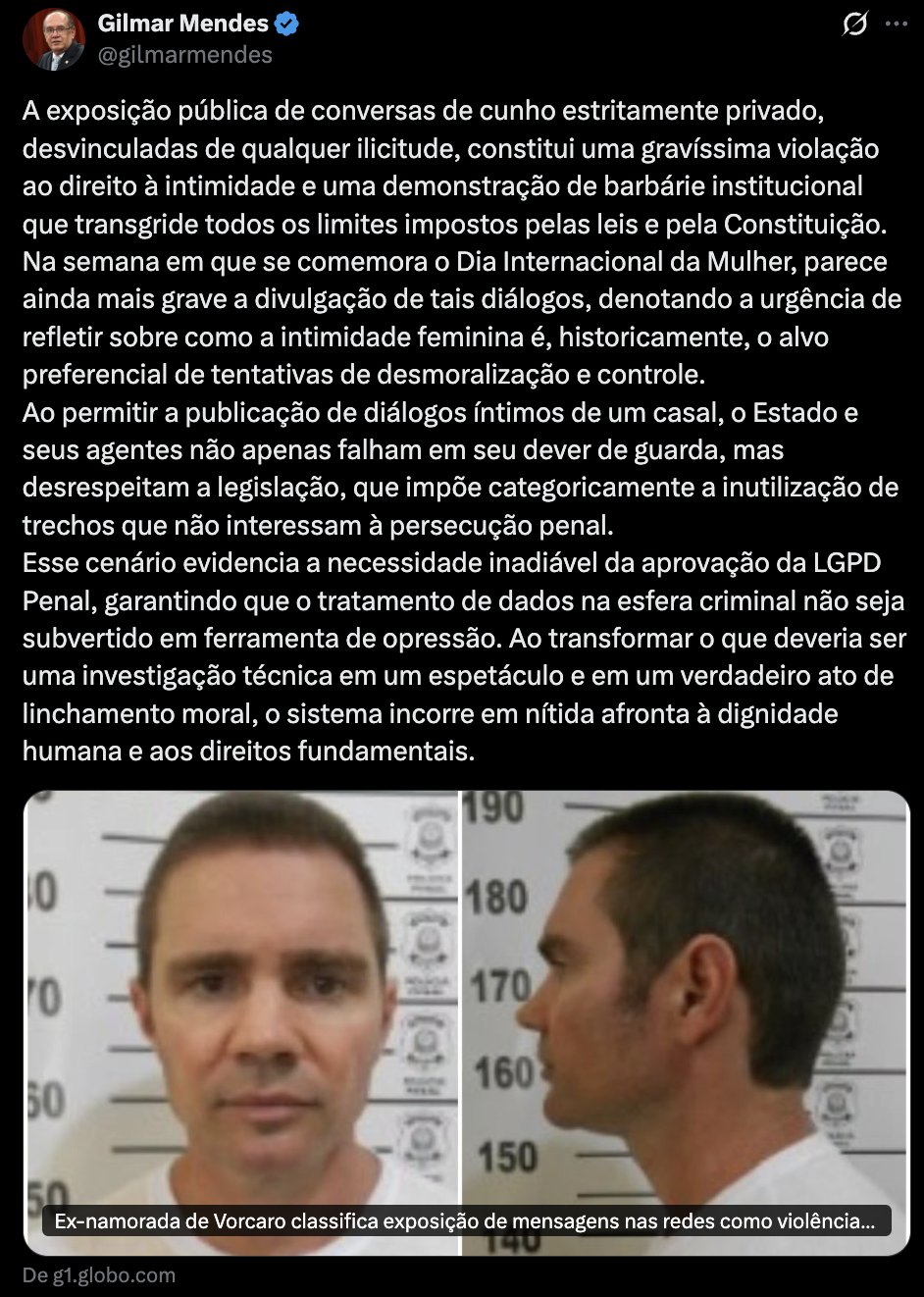 Na postagem, Gilmar afirmou que é necessário restabelecer limites na atuação da PF e criticou o que classificou como “espetacularização” de operações policiais. O ministro também sugeriu que determinadas ações conduzidas por delegados poderiam estar sendo influenciadas por motivações políticas, o que, segundo ele, comprometeria a credibilidade das investigações.
