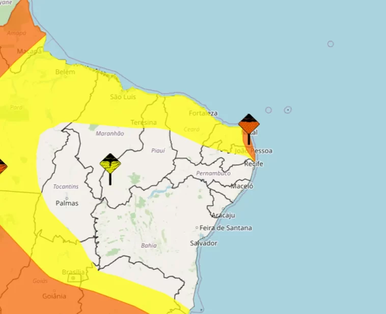 O aviso laranja abrange parte do litoral do RN e prevê chuvas entre 30 e 60 mm/h e de até 100 mm/dia. O Inmet alerta que, com chuvas desse nível, há risco de alagamentos, deslizamentos de encostas e transbordamentos de rios.