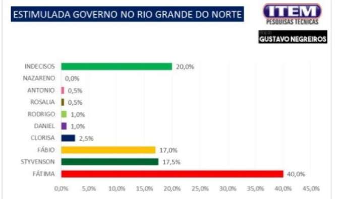 A pesquisa Blog Gustavo Negreiros/Instituto Item para o Governo mostrou que, na estimulada, Fátima Bezerra tem 40% das intenções de voto.