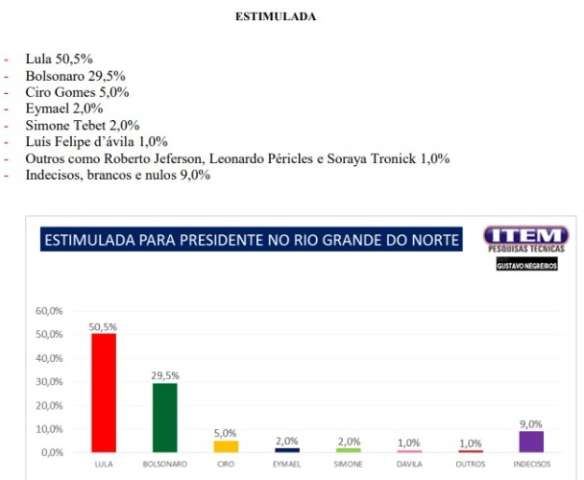 A pesquisa Blog Gustavo Negreiros/Instituto Item mostrou que, na estimulada para a Presidência da República, o ex-presidente Lula lidera com 50,5% das intenções de voto.