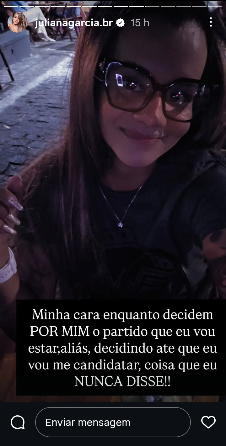 Em um story publicado no Instagram, a influenciadora afirmou que “estão decidindo por ela” até mesmo o partido e uma eventual candidatura, algo que jamais anunciou. “Minha cara enquanto decidem POR MIM o partido que eu vou estar, aliás, decidindo até que eu vou me candidatar, coisa que eu NUNCA DISSE!!”, escreveu.