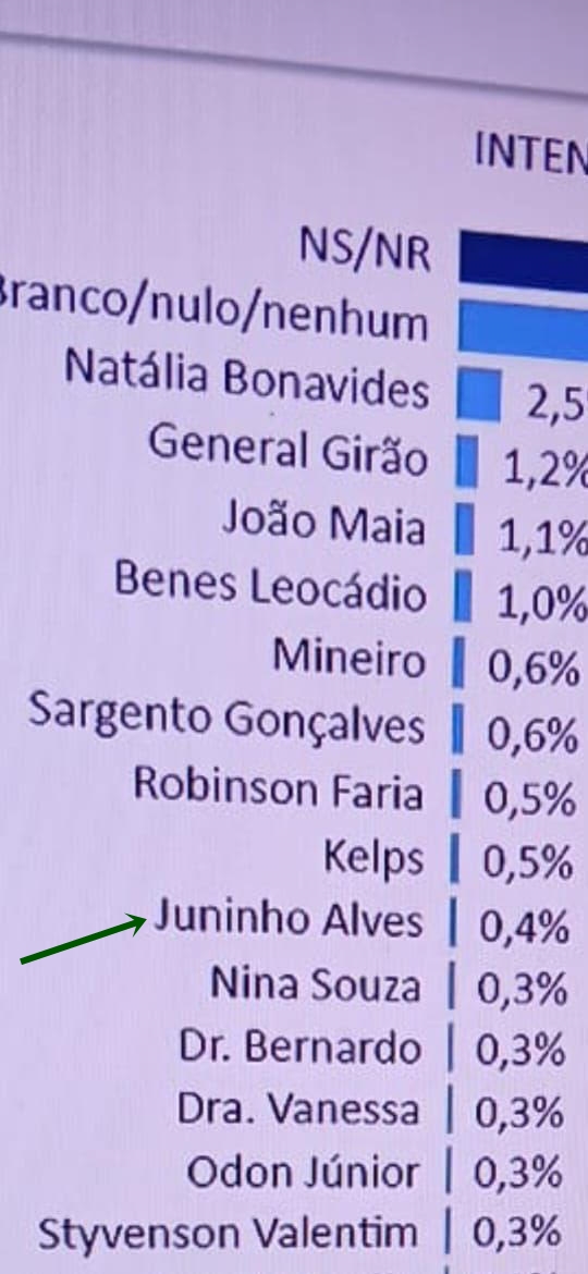 A mais recente pesquisa TCM/TS2, realizada entre os dias 23 e 26 de julho em 63 municípios potiguares, trouxe uma grata surpresa no cenário da corrida pela Câmara Federal em 2026: o nome do ex-prefeito de Caraúbas, Juninho Alves, aparece entre os mais lembrados pelos eleitores. Com 0,4% das intenções de voto, Juninho figura ao lado de nomes já consolidados no Congresso Nacional — um feito que, por si só, já merece destaque.