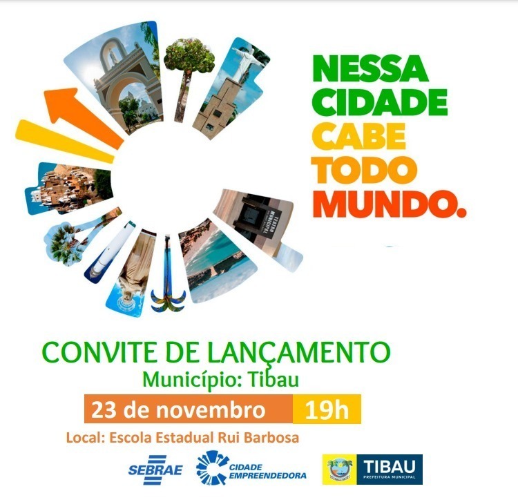 O Municipal de Tibau convida os empreendedores e a população para participar do lançamento oficial do projeto Cidade Empreendedora, no dia 23 de novembro, às 19 horas, na Escola Estadual Rui Barbosa – Rua das Oliveiras – Centro, Tibau – RN.