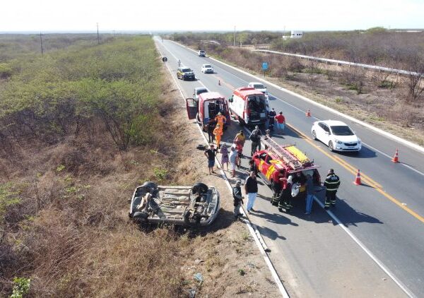 Veículo capota e deixa vítima presa às ferragens na BR-304 em Mossoró