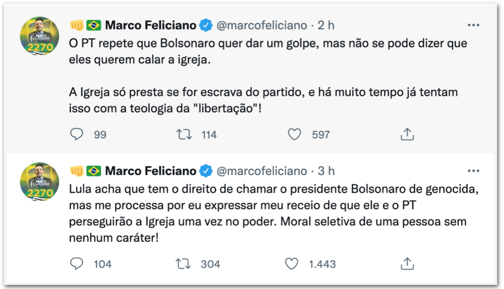 Feliciano fez uma série de posts comentando a ação. Disse que o “PT repete que Bolsonaro quer dar golpe, mas se pode dizer que eles querem calar a igreja”.