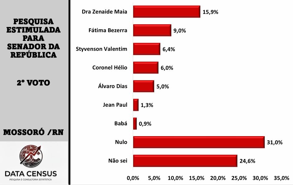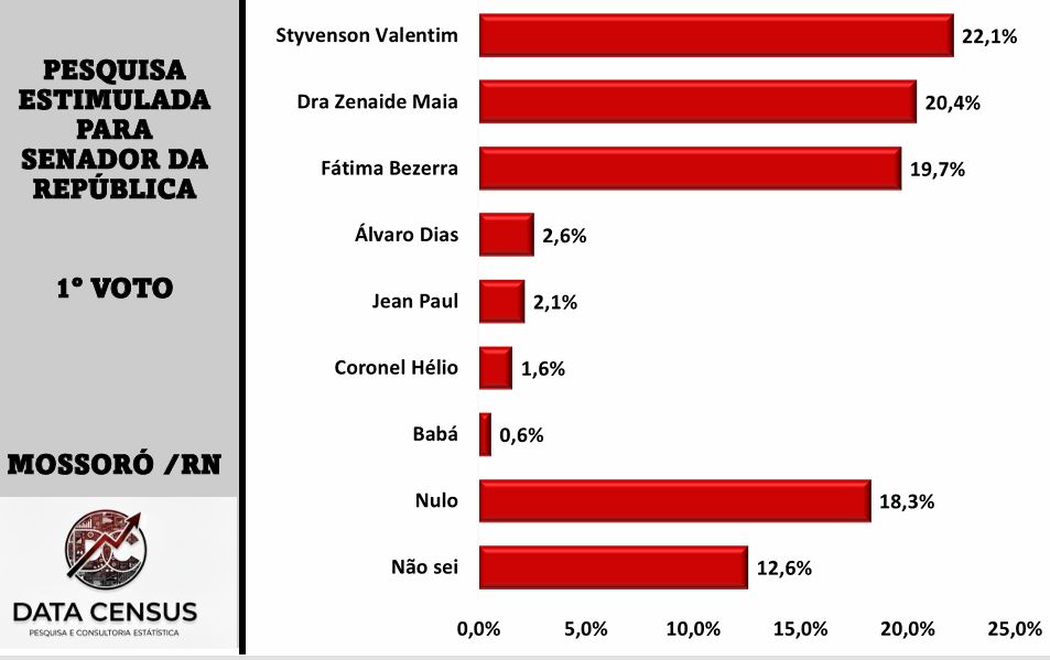 Uma pesquisa do Data Sensus realizada em Mossoró, segundo maior colégio eleitoral do Rio Grande do Norte, revela o cenário da eleição para o Senado em 2026. No levantamento estimulativo do 1º voto, Styvenson Valentim lidera com 22,1%, seguido de perto por Zenaide Maia (20,4%) e Fátima Bezerra (19,7%). O empate técnico, considerando a margem de erro de 3,4%, mostra um favoritismo inicial de Styvenson, que desponta como primeira opção de uma parcela significativa do eleitorado local.