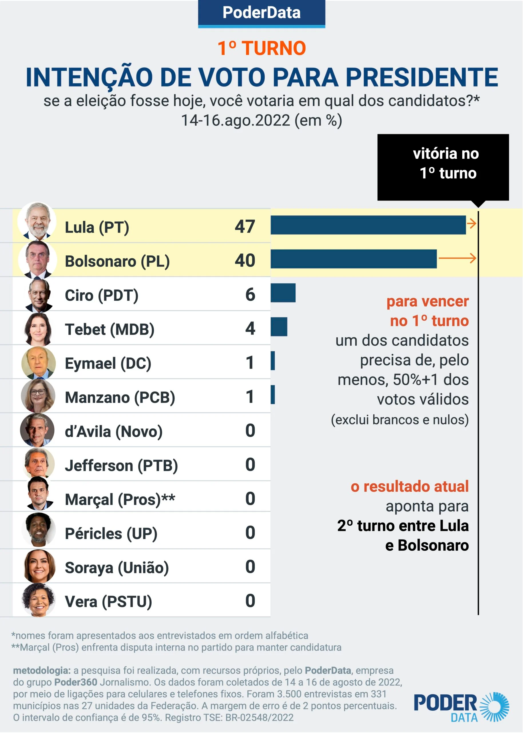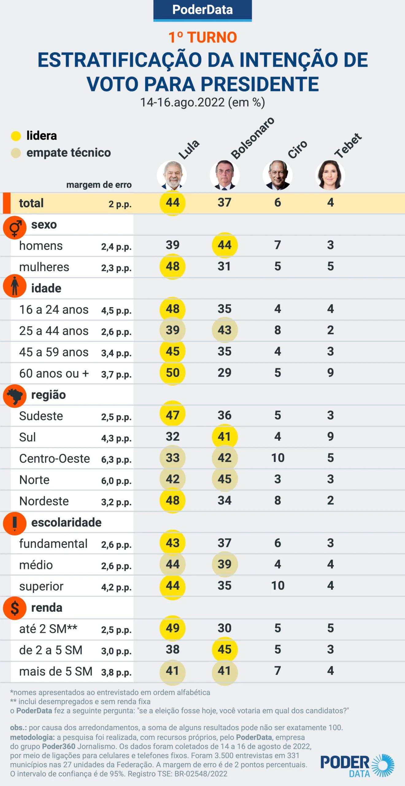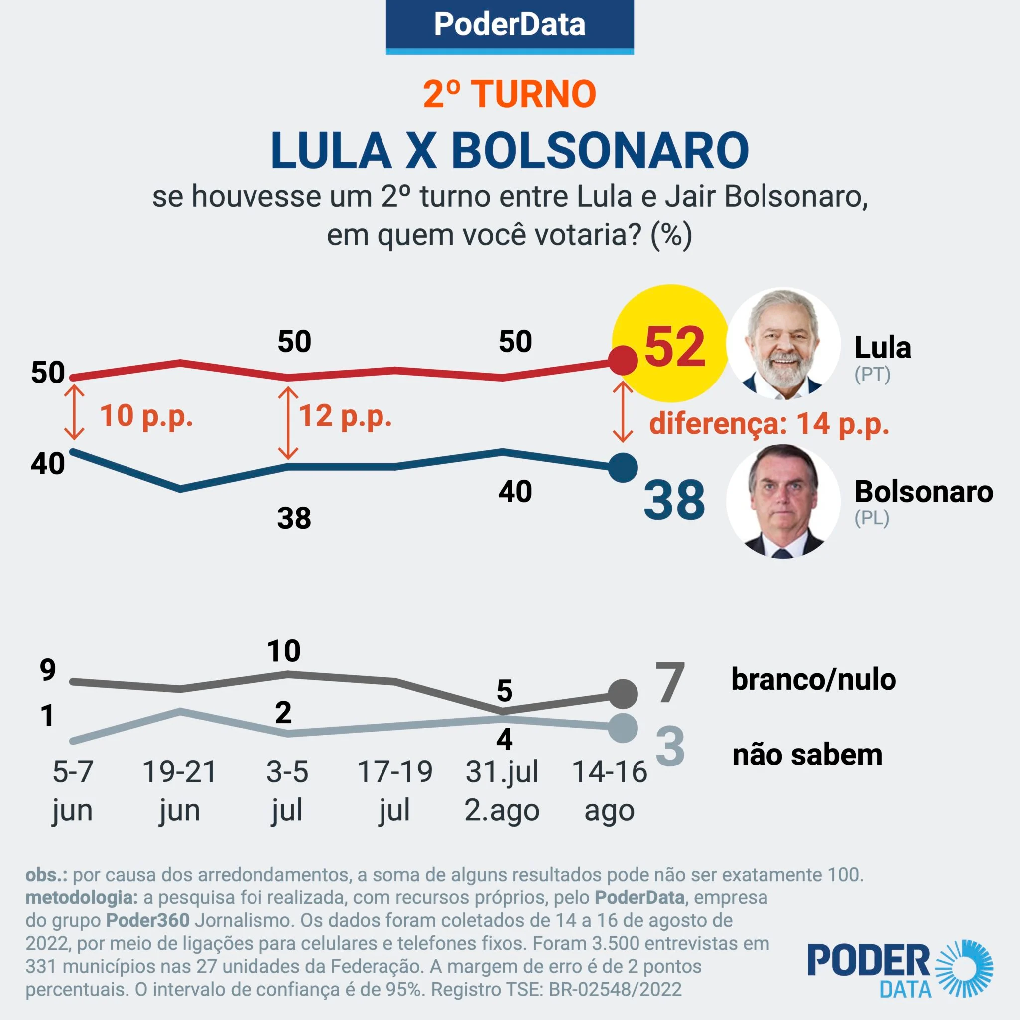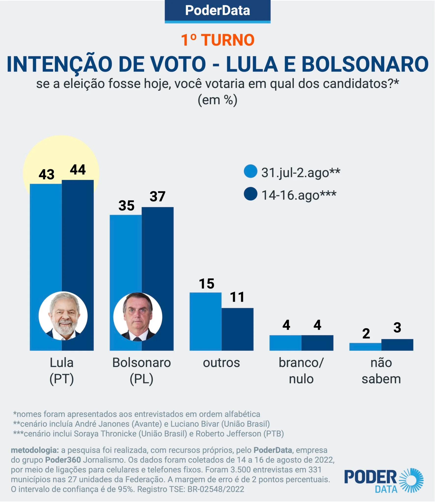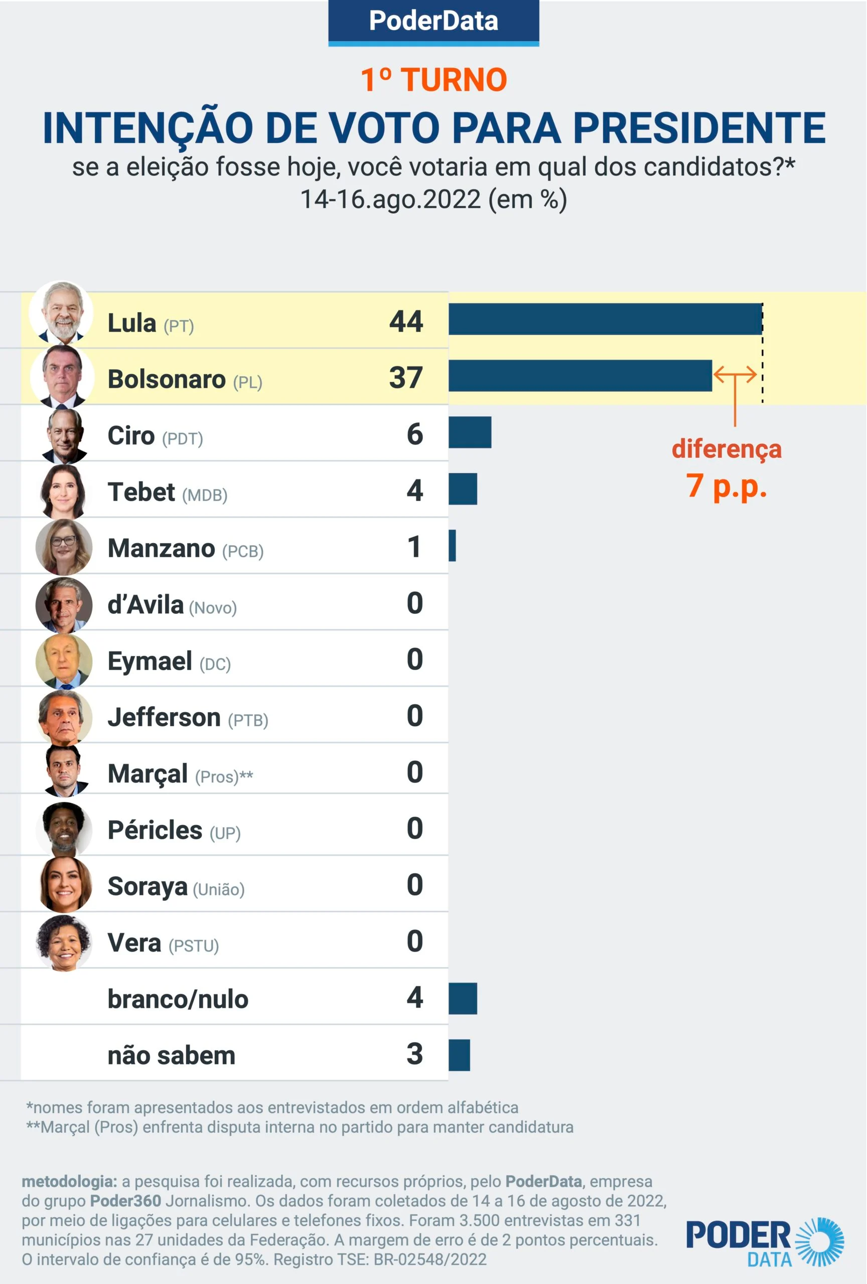Pesquisa PoderData com 3.500 entrevistas realizada de 14 a 16 de agosto mostra que Lula (PT) tem uma vantagem de 7 pontos percentuais sobre Jair Bolsonaro (PL) no 1º turno. Hoje, o petista tem 44%; o presidente marca 37%.