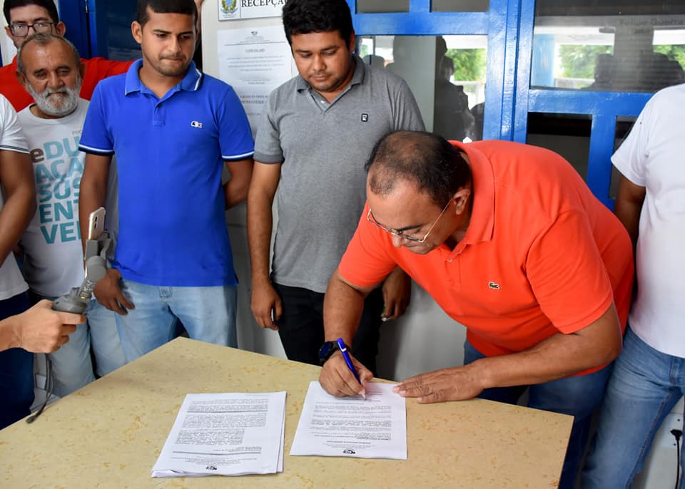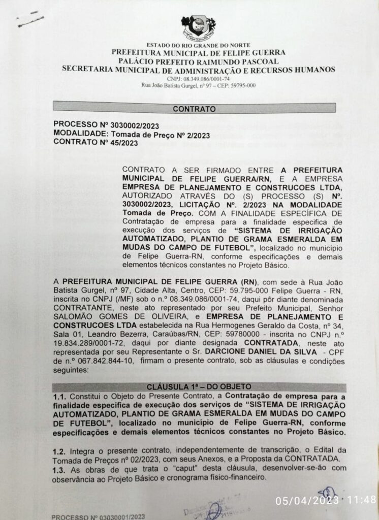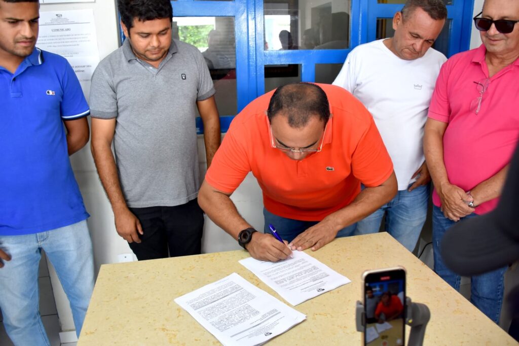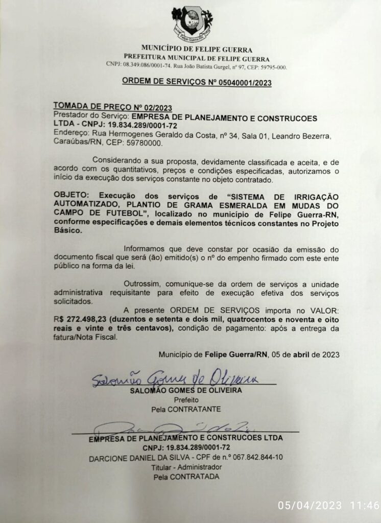 O Prefeito Salomão Gomes assinou, no final da manhã desta quarta-feira, 05 de abril de 2023, a Ordem de Serviço para o plantio da grama e instalação do sistema automatizado de irrigação do Estádio Municipal Antônio Cândido de Macedo Pascoal.