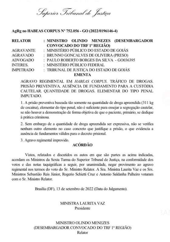 Preso em Goiás, o motorista de caminhão Brunno Gonçalves de Oliveira teve sua soltura determinada por habeas corpus. O documento é assinado pela ministra Laurita Vaz e Olindo Menezes, desembargador do Tribunal Regional Federal da 1ª Região (TRF-1) convocado para atuar como ministro. Mas a decisão da Sexta Turma foi unânime.